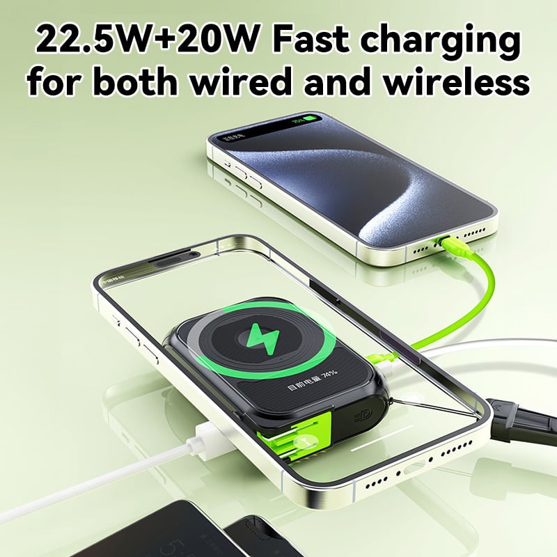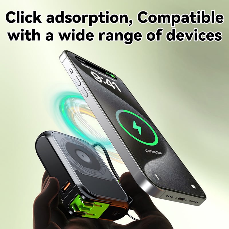 With its built-in folding AC plug,Ā this magnetic power bank allows you to charge directly from any outlet without needing extra cables. The compact, foldable design makes it easy to carry and store, while the handy lanyard lets you effortlessly hang it from your bag or carry it by hand, keeping it within easy reach.