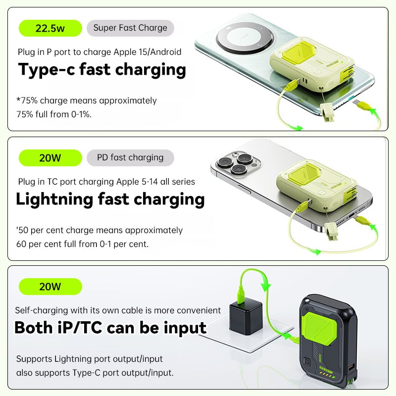 Never worry about running out of power!Ā Powered by a 10000mAh battery, our cell phone portable power bank supportsĀ fast charging up to 22.5W. It quicklyĀ recharges your phone to about 65% in just 30 minutes, andĀ the power bank itself is fully recharged within 2-3 hours.